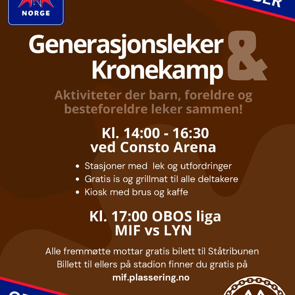 Generasjonslekene er først og fremst lek og moro på tvers av generasjoner. Det er folkehelse, bruk av nærmiljø og frivillige. Det er en mulighet til å skape entusiasme og samhørighet og har vist seg å være vellykket mange steder i verden. Nå gjør vi det i Mjøndalen også. Vi satser på en trivelig dag i Mjøndalen på tvers av generasjoner søndag 14 september kl. 14 til 16:30. Deretter kan alle gå på kampen MIF -LYN – alt er gratis.