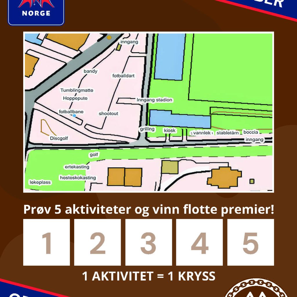 Aktivitetene foregår i området hovedinngangen til stadion. Bandy, fotball, fotballdart, boccia, discgolf, golf, hoppepute, tumbling med turn og mye mer. Vi har flotte valgfrie premier til barna så langt det rekker, samt gratis is og burger.